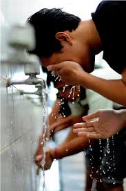 - Membasuh tangan –kanan kemudian kiri- hingga siku dan sambil menyela-nyela jari-jemari.